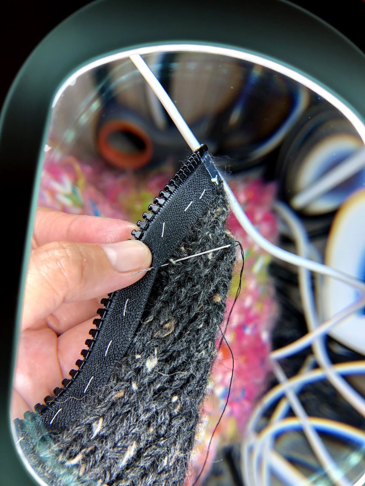 I wanted to publish this review a few weeks ago, but I ended up postponing it so that I could get good pictures of sewing the zipper. It was actually good I postponed, because I was able to really use the magnifier for the zipper. I hadn’t used the magnifier at all when knitting the sweater because the twisted stitches were pretty easy to see thanks to the bright light of the lamp, but the zipper was a different story since I was sewing it with needle and thread, and the thread was, of course, black.