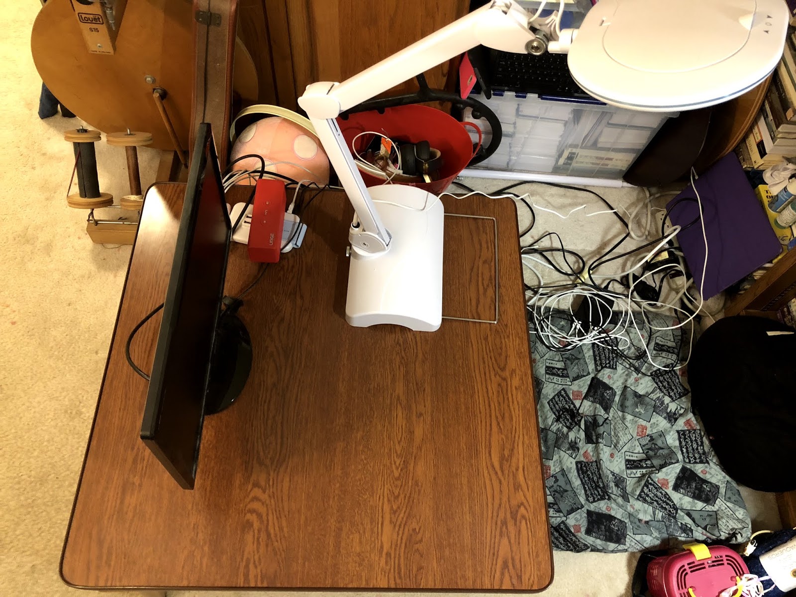 The lamp has an option to add an extender so that you could use this with a table and the magnifier would be right at a usable height. However, when I work, I switch between a standing desk and sitting on the floor and using my kotatsu, which is a Japanese coffee table, and I do my knitting on the floor, so I removed the extender and use the lamp with just the flexible arm. (I apologize in advance for my messy desk space and the tea stains on the carpet!)