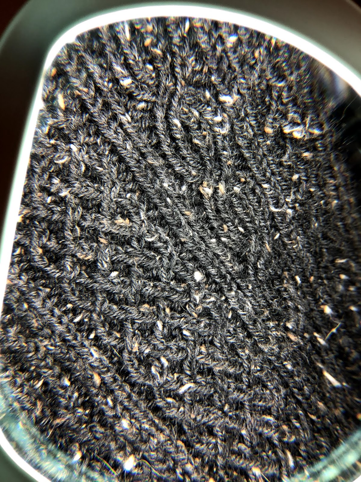 I took some pictures of my knitting, which is a twisted stitch sweater in black tweed. (Yeah, I know I’m a masochist.) The light is pretty bright and I could see the twisted stitches easily, despite the black color. I also took a picture under the magnifier, but I didn’t really need the magnifier when knitting the sweater.
