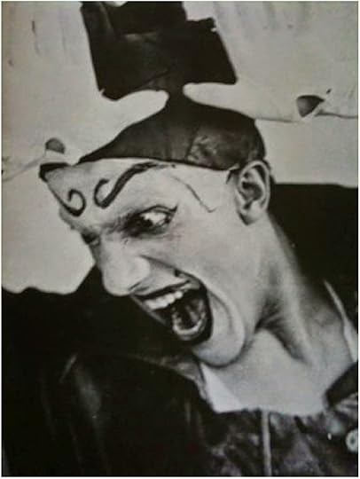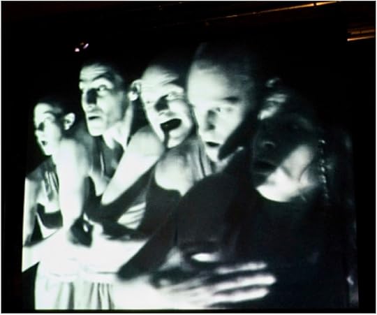 Dancer trying to stay awake on 'night watch': Tânia Carvalho's Weaving Chaos Guerra’s performance is not only is energetic and lithe, twisting and bending to create the various mazes and tests and challenges that the piece shows the dancers are faced with, but his facial expressions have the garish resemblance to an Eduoard Munch’s expression of ordeal, ‘The scream’, or a tortured clown mask, painted by James Ensor. Perhaps it is the mad house of Circe’s, when the crew, from their inability to resist greed, are turned into pigs, that dancers show lust and a constant search for stimulation and satisfaction. The dancers move individual frenzy but with graceful balletic movements.