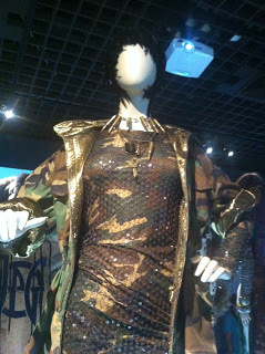 For me, the Jean-Paul Gaultier exhibition removed all skeptical doubts about the negative effects of fashion. This creator has defied the dangers of fashion becoming a uniform by embracing lovingly the uniforms themselves. Playfully he creates hybrids of the old traditional fashions with new: taking traditional nationalistic fabrics and flags and transforming them: Scottish tartan, Kente cloth from Ghana, Army kharki, black sado-masochist leather, Russian ermine, native American feathered head dresses.. and these are transformed into garments for the catwalk. There is a sense of celebration of past tradition by merging it with a creative present.