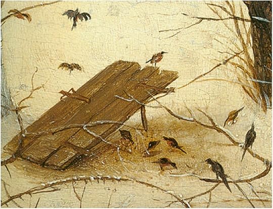 Worshipping of a False Prophet, BrueghelHis painting ‘bird trap’, a wooden board with a rope leading to the hand of some hunter, perched ready to slam down upon ravenous birds below, is a mere metaphor for the dangers of the skaters on the frozen lake, whose lives are in peril at any moment should the ice suddenly crack.