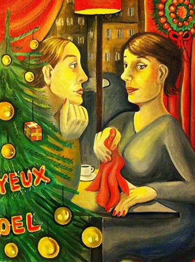 But finding it too droughty, I left the station and wandered over the road to find a cosy little café. It had red velvet seats and a christmas tree, which looked rather fat and drunken and about to topple over. It was covered in odd shaped baubles. Beyond it were too women dipping into their discussion with as much gusto as the food they were eating. They didn't notice me drawing them.