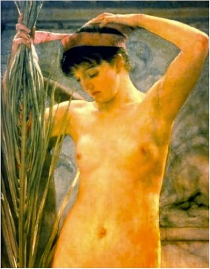 In order to slip by Victoria's tight dress code, the painters of the day went out of their way to ground their work in an historical context. Alma Tadema visited Pompeii, and while the Victorians were digging up its treasures, he was sketching away, inspired by Greek and Roman antiquity, and setting the ball rolling by cleverly placing his delightful and desirable nudes in acceptable mythical contexts, making it proper and learned. And Frederic Leighton picked up from where Ingres left off. He was inspired by Ingres' very classical nudes, he continued this tradition, as did Waterhouse, Talbort Hughs, Strudwick and Emma Sandys with their paintings and studies set in historical and mythical contexts.