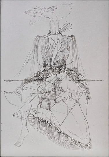Image from exhibition Subliming Vessel by Matthew BarneyToday I went to see 'Subliming Vessel: The drawings of Matthew Barney'. At the end of at a long corridor under the ground, were Matthew Barney’s drawings. On first entrance, I snooped my way through a glass covered cabinet and tiny pencil drawings, and like Goldilocks, nosed my way into the glass like a peeping Tom at curiosities, private scenes and freak pictures: an anus excreting, an erotic Japanese print of a couple having sex, a man putting his penis into a car exhaust pipe…. A hermaphrodite with a beehive body, a murderer, a corset, Equis, an Anubis being born, a goat portrait and man with goat shaped face, a Masonic pentagon, a Norman Mailer book, extraordinary feats of Houdini, a bloody chopped off penis ….