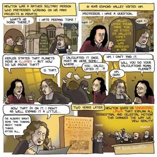 Here’s a page from the chapter about Isaac Newton. It seems he was a rather grumpy man, which made it great fun to make a comic about him.