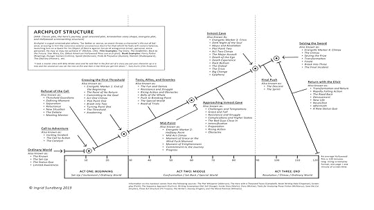 Anyway, after a bit of research (planner, remember?), one of the first things I came up with was the story structure and its main plot points. For the sake of simplicity, I used a 3-act structure, a storytelling model most often used in movies. Given my desired novel length, a 3-act structure seemed like a good fit. I’m also a very visual person, so for me it was helpful to overlay the main story points onto a diagram (I found the great graphic below on Ingrid Sundberg’s blog on writing*).