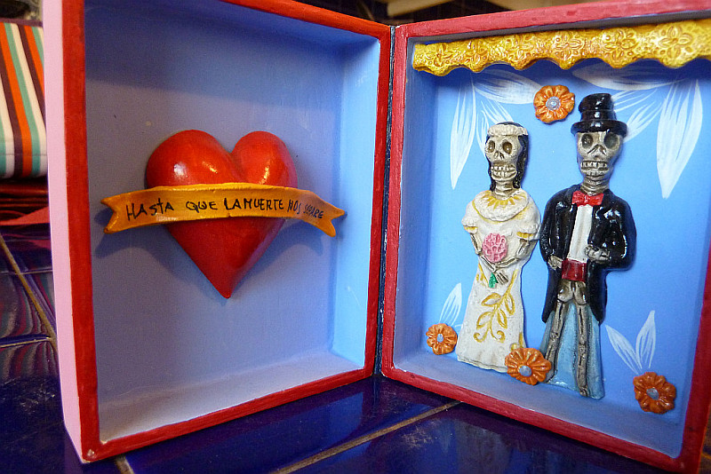 We've pointed out elsewhere how it took Ana a while to appreciate the Mexicans' acceptance of death as a part of life, a view that on her planet might be considered inappropriate. Not everyone on Earth would agree, either. Yet the tiny figurines below clearly reveal that such an attitude is more affectionate than mocking. Thousands of these are made in Mexico. Many are for sale, and Ana loves them now. The examples below will give some indication.