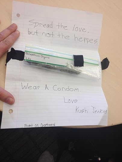 University of Guelph, Ontario, Canada. The text with this image is “There’s a guy at my University who goes by the name, Kush Jenkins, that leaves people weed in the library.” Thanks, Steve Lawson!