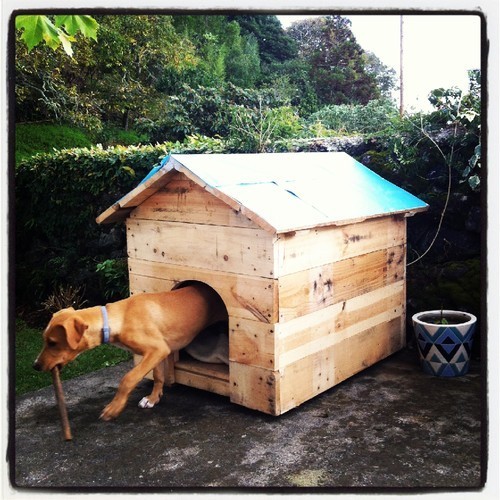 Domingo precisava de ter descansado e acabei por passar boa parte do dia a trabalhar. Entre uma série de outras coisas, tive de colar uma tela de alcatrão sobre a casota do Melville. Com a chegada da chuva, a resistência dele em ir à rua e a sua crescente energia tornam esta casa numa espécie de manicómio para casos em último grau, não me deixando trabalhar em paz (nem à Catarina, aliás). Portanto, resolveu-se o problema da casota. Hoje fui dar com o bicho em cima do muro do caminho, com talvez uns cinco metros de altura do lado de fora – e lá passei mais um bocado da tarde a comprar redes, tubos galvanizados, serrilhas e uma data de outros instrumentos para fazer mais uma vedação ainda. Aparentemente, esta casa só pára quando tiver virado um bunker. E, mesmo assim, há-de surgir outra brecha de segurança qualquer a seguir.