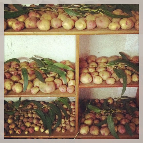 Cobri hoje as batatas de folhas de eucalipto, para afastar as pragas. Ao todo, e mesmo sem as ter sachado e só por uma vez as ter sulfatado, deram um rendimento superior a mil por cento. Para além de tudo, são saborosas, são minhas e vão dar para o Inverno inteiro, mesmo oferecendo um monde delas em volta. Já não estou tão certo de que em 2014 não volte a semeá-las.