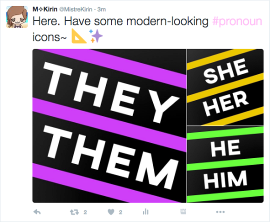 Following the silliness that was that exchange, I decided to go on ahead and make some gender pronoun icons, they’re up on my Twitter!