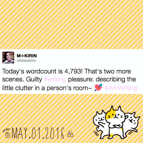 So, apparently I haven’t posted a writing update in almost a month? That’s criminal! Really sorry about that I post them daily on Twitter (twitter.com/MistreKirin)! Anyhow, here’s today’s update~