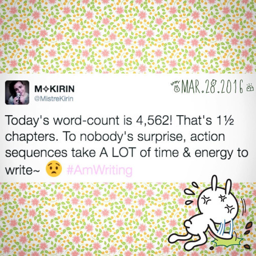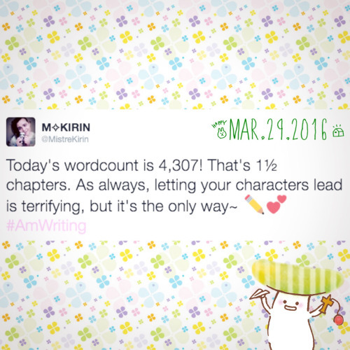 4,307 words, 1.5 chapters. Today’s session just flew by, it was a very intense couple of chapters. I actually wrote and rewrote the last sentence probably like 20 times until it finally sounded right~