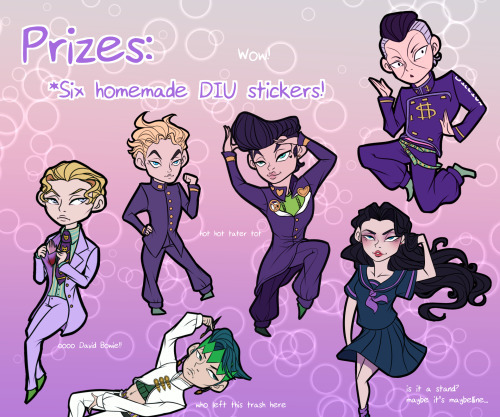Happy“Duwang” Giveaway!Because I’m very excited for Part 4 Anime in April, I’ve decided to give away some DIU stickers I’ve made! (Examples can be found here!)