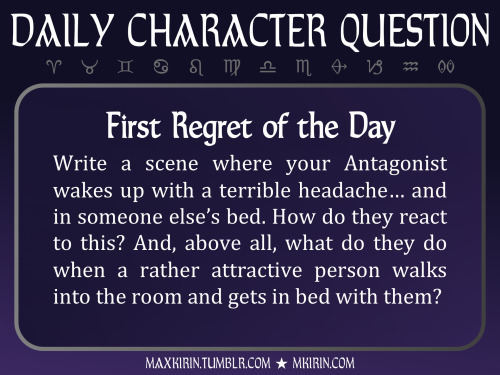 Write a scene where your Antagonist wakes up with a terrible headache… and in someone else’s bed. How do they react to this? And, above all, what do they do when a rather attractive person walks into the room and gets in bed with them?