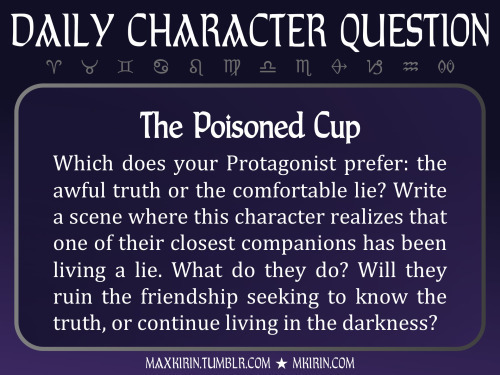 Which does your Protagonist prefer: the awful truth or the comfortable lie? Write a scene where this character realizes that one of their closest companions has been living a lie. What do they do? Will they ruin the friendship seeking to know the truth, or continue living in the darkness?