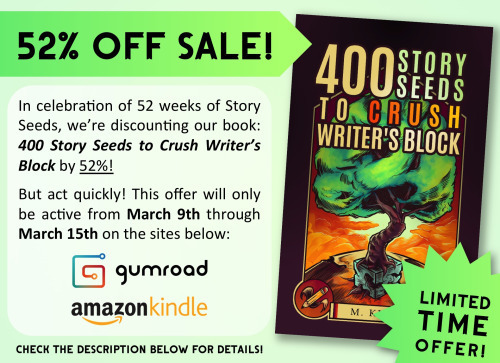 In celebration of 52 weeks ofStory Seeds, we’re doing a sale on my best-selling book: 400 Story Seeds to Crush Writer’s Block!