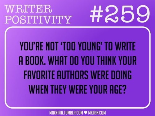You’re not ‘too young’ to write a book. What do you think your favorite authors were doing when they were your age?Want more writer inspiration, advice, and prompts? Follow my blog: maxkirin.tumblr.com!
