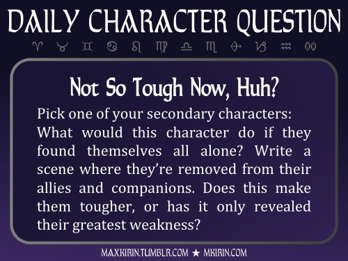 What would this character do if they found themselves all alone? Write a scene where they’re removed from their allies and companions. Does this make them tougher, or has it only revealed their greatest weakness?