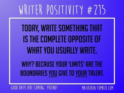 Today, write something that is the complete opposite of what you usually write. Why? Because your ‘limits’ are the boundaries you give to your talent.