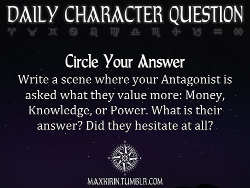 Write a scene where your Antagonist is asked what they value more: Money, Knowledge, or Power. What is their answer? Did they hesitate at all?