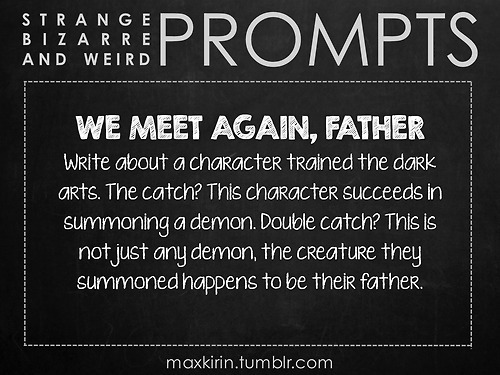 Write about a character trained the dark arts. The catch? This character succeeds in summoning a demon. Double catch? This is not just any demon, the creature they summoned happens to be their father.
