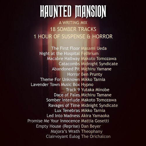 This playlist contains 18 of my favorite tracks for writing horror, terror, and supernatural suspense!What brought you here, foolish mortal? Why did you trespass into the domain of our mistress? You explore the halls of her mansion, you attempt to loot from her riches,...