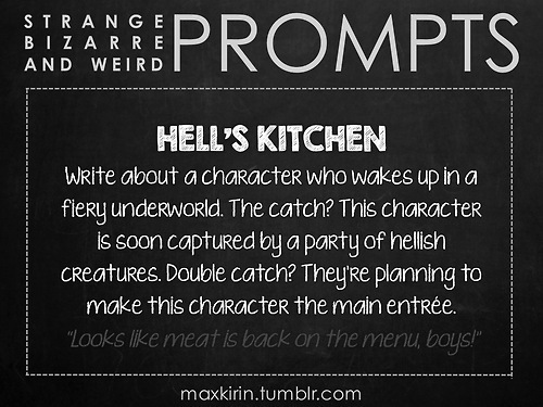 Write about a character who wakes up in a fiery underworld. The catch? This character is soon captured by a party of hellish creatures. Double catch? They’re planning to make this character the main entrée.