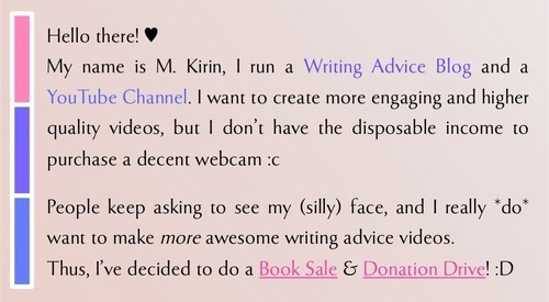 As most of you know, I have been running a little show on Youtube called the Virtual Writing Academy, where I offer weekly creative writing exercises and advice. I really love doing that show— and I want do to so much more, but I am limited by the equipment I have. With a decent webcam I would be able to create better videos.Unfortunately, I don’t have the disposable income at the moment to make such a purchase… So, I’ve decided to do a Book Sale an...