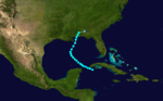 The ninth storm of the 1934 Atlantic hurricane season formed in the western Caribbean near Cuba's Isle of Youth on the first of October. It moved somewhat slowly northwestward past the western tip of Cuba and into the Gulf of Mexico. On October 4, while in the middle of the Gulf, it re-curved to the north-northeast, reaching its peak intensity of 60 mph (97 km/h) as it did so. It made landfall on Dauphin Island, Alabama late into the next day as a weakening storm. It dissipated inland the next day, having caused no significant damage.