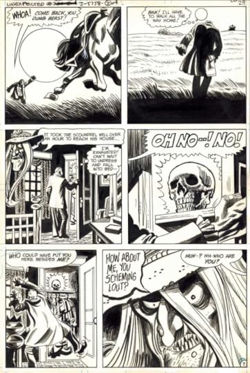 By the 1970’s his artwork had become very unique and, let’s be honest, perhaps a little too odd for popular consumption. The artwork, in my opinion, looked like comic book versions of The Cabinet of Dr. Caligari, expressionistic works with heavy shadows and almost bizarre backgrounds. The piece below appeared in the DC horror title The Witching Hour…