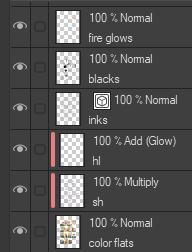The layers with the red bar beside them are clipped to the layer below. Because I am lazy, shadows are “sh” and highlights are “hl”.