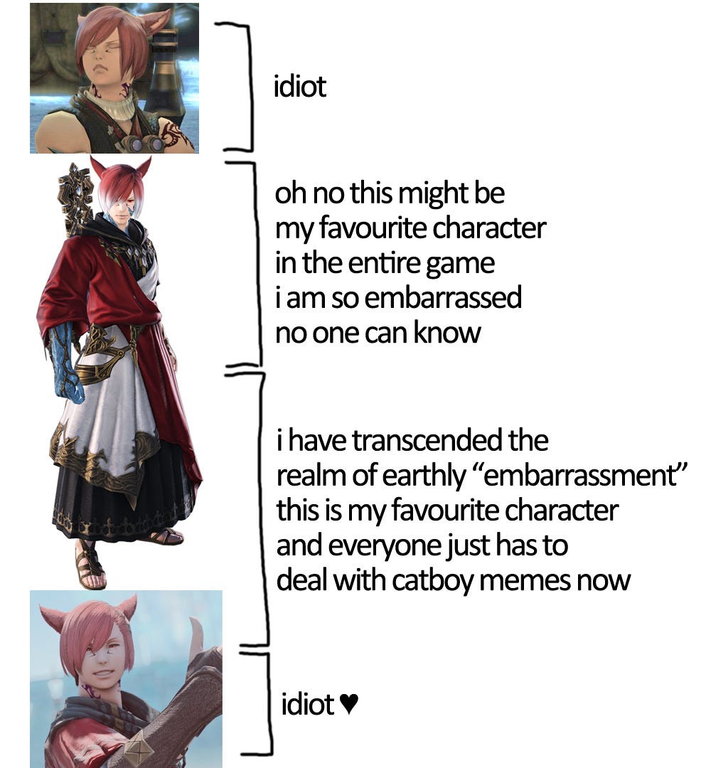 Meanwhile, the new character in the new expansion isn’t competent at anything. She’s the YA girlboss who is a princess who somehow wasn’t educated in anything about her own country. She gets seasick (and airsick and carsick) despite being a toughened warrior. She succeeds at everything OFF-SCREEN while your character, the hero of the story, waits around the campfire for her to come back. (There is a campfire scene on average every 1-2 hours of playtime.) Everything is handed to her, she earns nothing, and she is competent at nothing except … talking to people? And even then she’s still dumb as a box of rocks. AND YET she defeats the final boss FOR YOU, stealing your moment of glory, with her powers of … talking to people. You know it’s bad when you can scroll Tumblr for hours and see more fanart of every other supporting character but not her.