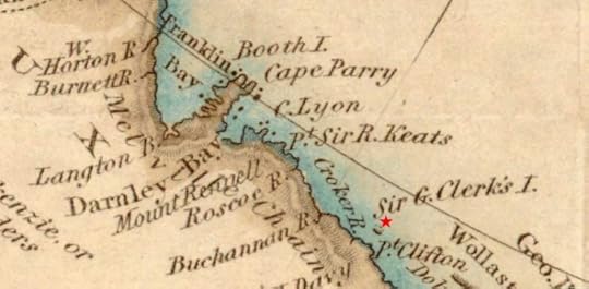 I added a red star to help locate Sir George Clerk’s Island on the above section of a map published in 1828. With the help of Internet maps about two centuries later, we can still find Cape Parry and Darnley Bay. To the southeast lie Cape Lyon and the mouth of the Roscoe River. Farther on run both the Buchanan and Croker Rivers. All these landmarks remain with the same names, suggesting the 1828 map was impressively accurate!
