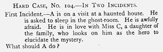 The next week, the “right” responses are so contradictory that the smitten yet shivering “A” wouldn’t know what to do. Several readers advise him to muster the courage to sleep in the haunted chamber. Others agree, but add that he not do so alone: share the investigation with Miss C and her mother, a friend, “a couple of bottles of port,” or a bribed butler. On the other hand, a few readers tell A to confess his fears. The implication is that he might offer to share a bedroom with someone rather less deceased.
