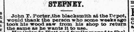 Silas Cranna was an inveterate tippler [meaning an alcoholic] and passed much of his time [drinking] at an inn that stood at the present site of Porter's blacksmith shop, near Stepney Depot.Please permit me a quick digression. In 1900, there was a blacksmith named Porter who worked near the Stepney train depot. The notice below shows he wanted whoever pilfered his saw to return it, if you please!