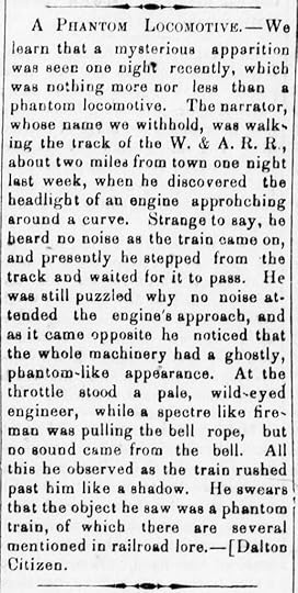 The two articles end a bit differently, though. In 1881, the witness claims to have seen two spectral trainmen. In 1883, the train is described as having been semi-transparent: “objects on the opposite side of the railroad were distinctly visible.” Still, I can’t help but wonder if somehow the Marietta Journal and the Citizen are describing the same encounter.