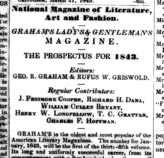 It’s interesting that another writer, a fellow named Edgar Allan Poe, had published quite a bit in Graham’s by the time this advertisement appeared. Along with literary reviews and some of his most cherished poems, outstanding tales written by Poe — namely, “Murders in the Rue Morgue,” “A Descent into the Maelström,” and “The Mask of the Red Death” — had all been printed in Graham’s. Nonetheless, in late-1842, Poe seems to have lacked what Hoffman had earned: the name recognition that might sell magazines.