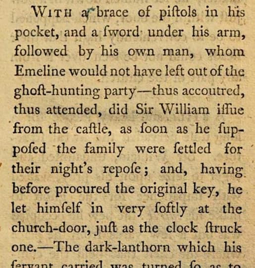 .Yep, a character named Sir William Montreville sets out late at night, armed with piftols and fword — uhm, pistols and sword — for some ghost-hunting with his servant! Earlier, the character interviews those who claim to have witnessed a specter at the church. While remaining skeptical, he promises “he would himself go in search of this terrible ghost.” Upon arriving at the site said to be haunted, Sir William sits hidden in a pew, watching and waiting. Nocturnal surveillance — the hallmark of ghost hunters since Athenodorus! In other words, this use of ghost-hunting isn’t a way of saying a fool’s errand or some other figure of speech. Though intending to debunk the haunting, Sir William is acting as a ghost hunter in the way I suspect most people today apply that label.