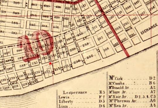 The 1870 map cropped to show where Main met Mullanphy. I put a red star at the spot.A Short Side TrackThe article says: “The spot most frequented by the apparition is the site of the old Waddingham mansion. The old house was torn down in 1830 to make room for the M.K.&T. freight-house.” I had hoped this landmark would confirm the location, but I’m having difficulty learning much of anything about the Waddingham mansion. Somehow fittingly, it seems to have vanished without a trace! I did discover that a few , which is alleged to have a few ghosts of its own.