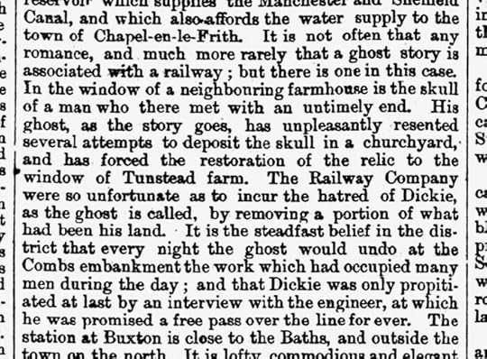 About two miles and a half from Whaley Bridge the line crosses the head of the Combs Valley, near the reservoir which supplies the Manchester and Sheffield Canal, and which also affords water to Chapel-en-la-Frith. Here, for about a quarter mile, the engineer, Mr. A. C. Crosse, met with the greatest difficulty. It was necessary to construct a bridge beneath which the road from Combs to Chapel might pass. The navvies dug through scores of feet of clay resting upon sand, but could find nothing upon which to build a foundation. The earth also of which the embankment was to be made forced outward the surface of the ground, and made it bulge to a remarkable extent. Finally, the Company were compelled to abandon the construction of the bridge and to build another upon the nearest solid ground that they could find. This has necessitated a considerable diversion of the highroad.While there’s no mention of the ghost in that article, there is in an otherwise almost identical one that appeared two days later in the Nottinghamshire Guardian: