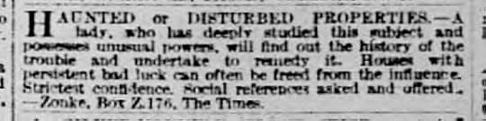 Vera Van Slyke (1868-1941) and Ludmila “Lida” Bergson (1882-1958), née Prášilová, a.k.a. Lucille ParsellYet, quite a few years ago, I came upon and blogged about a 1919 advertisement with the heading: “HAUNTED OR DISTURBED PROPERTIES.” The ad, run in London’s The Times, offers aid from a person who “will find out the history of the trouble and undertake to remedy it.” This has intriguing similarities to an ad run by Van Slyke, as discussed in Help for the Haunted: A Decade of Vera Van Slyke Ghostly Mysteries. However, I had never seen the quirky ad itself until now:
