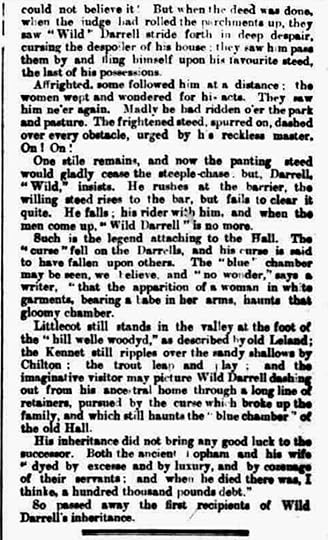 I did, however, find a couple of newspaper articles by the same authors. In fact, I found the article that first stirred interest in the haunting. It was published in London’s The Standard on April 22, 1896, and the writer reviews a variety of weird phenomena happening at what he renames “Silverton Abbey” to protect the actual place. (The real names of the building and the letter writer are divulged here.)