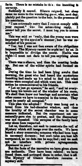 We are fully aware that the usual objections will be urged; but we can only say we took all precautions, such as examining bolts, bars, &c., and patrolling the house twice during the night, being provided with a pistol and lights, and the fact remains, based on our joint testimony, that the most unusual sounds were heard, which we who heard them are quite sure could not have been caused by rats, cats, wind, and so forth. We can offer no explanation, and must refer any one interested to the various authors and Societies who investigate these matters.In other words, Fitz-Maurice and Pooley were not among those more formal investigators. The manifestations seem fairly routine, if not disappointing, but it would be interesting to read that pamphlet to get a sense of how amateur ghost hunters went about their business.