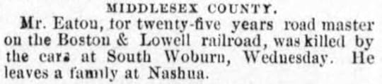 If nothing else, this provides a distinctive backstory to a railroad haunting that was chronicled in newspapers in early 1870. But Eaton’s spirit isn’t the only candidate to explain the haunting. A list of accidents on the Boston and Lowell line appears in an 1867 report on railroad corporations, and Eaton’s death is accompanied by another possibility: “August 12. — Sumner Clark, while walking on the track near East Woburn, was struck by a train, receiving injuries which caused his death.” However, Eaton’s professional dedication to railroad safety — and the probability that his accident occurred at Woburn Watering Place — make him a better fit for the specific manifestations of the haunting.