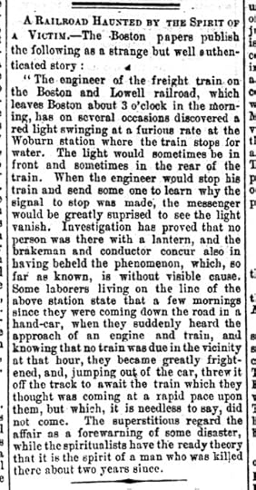 From the February 2, 1870, issue of The Daily Dispatch, a paper published in Richmond, Virginia.It’s an especially weird case in that there are two distinctive manifestations reported: the sighting of an inexplicable swinging red light and the sound of a train that never appears. It’s also interesting that two theories of the haunting are posited: a sign of future danger, or a spirit of past tragedy. I haven’t explored the forward-looking possibility, and Eaton’s death is the best evidence I’ve found to support the ghost theory.