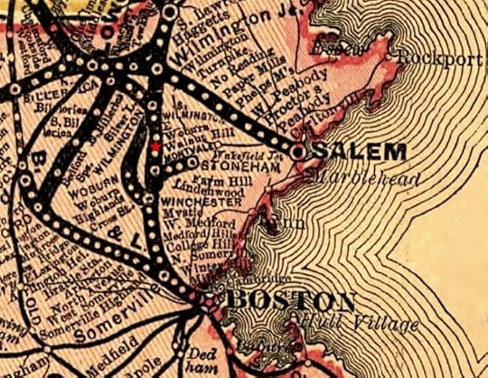 I put a red star on this detail of a map of the Boston & Lowell Railroad (circa 1890) to indicate the probable spot where the spectral red light was observed.Now, the ghost report is very vague about where the phantom train was heard. I think that might be a lost cause. We can do much better with the spectral red light, though, because it was observed “where the train stops for water.” There’s that stop marked as such on the 1867 schedule, and according to a 1918 history of the Boston & Lowell, “For many years the station now called Walnut Hill was known as Woburn Watering Station.” Walnut Hill is marked on the 1890 map, and it remains an eastern neighborhood of Woburn today. An interested ghost hunter might use this location to carefully explore the tracks that still run — and are still used — between Winchester and Wilmington. They run parallel to and east of Wildwood Avenue.