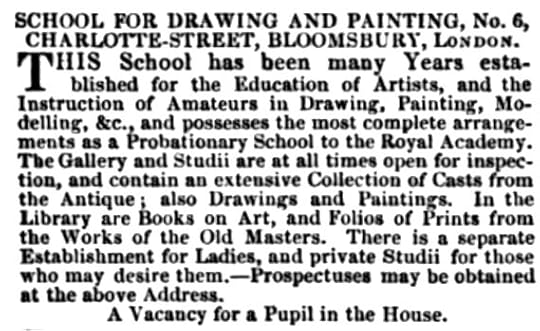 The next story is set in dated 1701. Not much better. But the third is said to have happened in 1829, so within the living memories of most of Hooten’s readers. There’s mention of “the celebrated establishment for drawing in Charlotte Street, Bloomsbury,” in London, and according to this advertisement in an 1841 Art magazine, at least that part of the story is true.