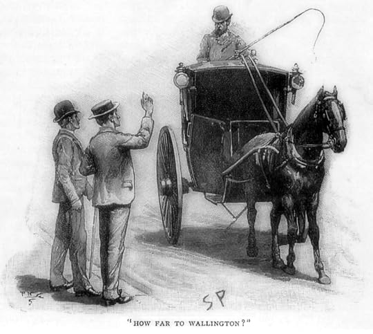 A hansom cab is featured in this illustration for “The Adventure of the Cardboard Box.” It’s one of Sidney Paget’s many depictions of Sherlock Holmes, and here the great detective is sporting a boater hat!Don’t you dare quote me on this, but I sense that dog-carts were generally used in rural settings while city folks were more prone to hail a hansom cab. (The H in “hansom” was sometimes capitalized and sometimes not.) Another two-wheeler, this vehicle is described in an 1894 source as “admirably adapted for the crowded streets of great cities.” A key difference between this and a dog-cart is the placement of the operator: the hansom perched drivers high and behind. Related to this modification, the hansom was better suited for only two passengers while dog-carts could comfortably carry four — though some would have to face backward, possibly making a few riders sick as a dog.